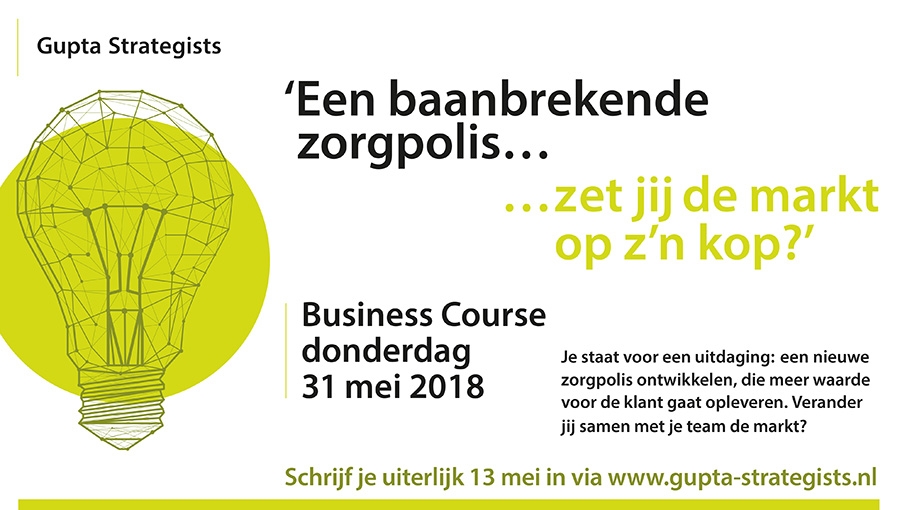 Op 31 mei organiseert strategy consultancybureau Gupta Strategists weer een uitdagende business course. In deze editie duikt een groep topstudenten in de wereld van polissen van zorgverzekeraars. Ze krijgen de opdracht om een innovatieve en baanbrekende zorgpolis te ontwikkelen. Gedurende het evenement leren de deelnemers aan de hand van een praktijkcase hoe het is om te denken en te werken als een strategieconsultant, en maken ze kennis met het team van Gupta Strategists. De inschrijving loopt nog tot 13 mei.