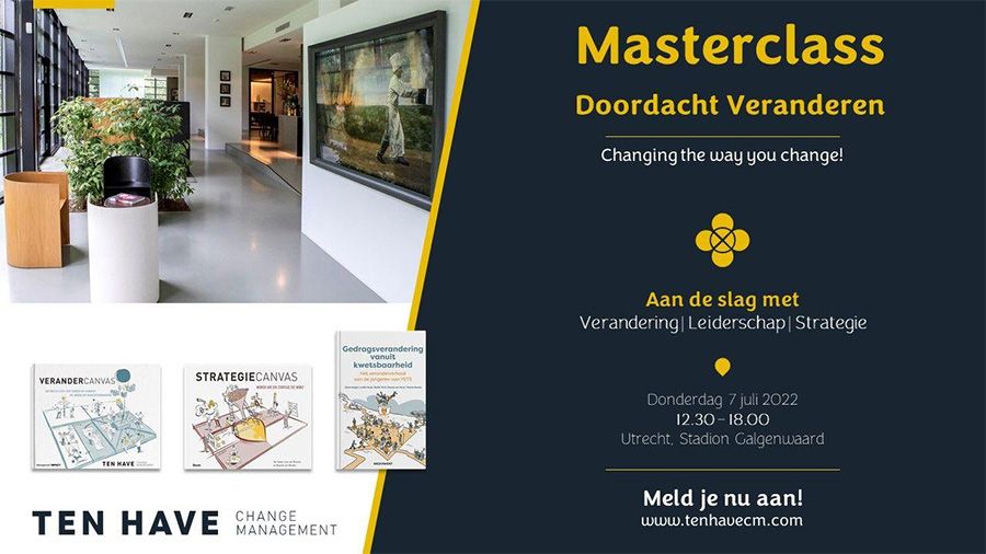 TEN HAVE Change Management neemt je op ๐๐จ๐ง๐๐๐ซ๐๐๐ ๐ ๐ฃ๐ฎ๐ฅ๐ข (12.30 - 18.00 in Utrecht) in de Masterclass Doordacht Veranderen mee in hun expertise op deze gebieden. Na een gezamenlijke en inspirerende start met o.a. ๐ค๐๐ฒ ๐ง๐จ๐ญ๐ door Wouter ten Have (hoogleraar Organisatieverandering) ga je in een kleine groep aan de slag tijdens een verdiepende workshop gericht op Verandering, Leiderschap of Strategie, begeleid door ervaren adviseurs van THCM.