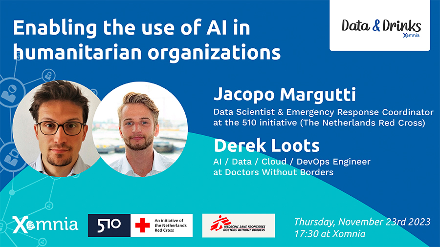 The November edition of the Data & Drinks event is approaching fast, and it is going to be a very special one! Join us on November 23rd at 17:30 in Xomnia's HQ in Amsterdam for a night entirely dedicated to AI & data applications in the humanitarian sector. Our speakers are Jacopo Margutti, Data Scientist & Emergency Response Coordinator at the 510 initiative (The Netherlands Red Cross), and Derek Loots, AI / Data / Cloud / DevOps Engineer at Doctors Without Borders.