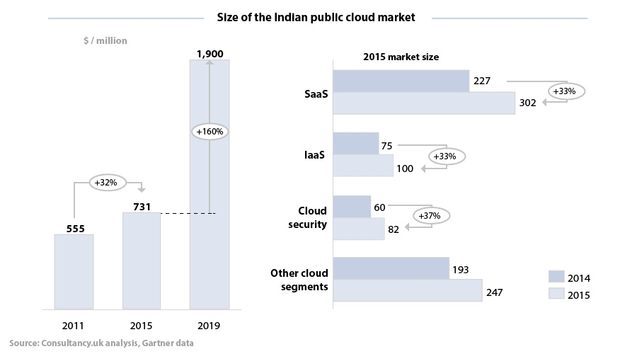 Volgens Gartner heeft in 2015 de Indiase markt voor public cloud services een waarde bereikt van $731 miljoen – wat in vergelijking met 2011 een waardestijging van $176 miljoen betekent. Deze groei wordt aangedreven door de sterke groei in verschillende belangrijke marktsegmenten, waaronder het cloud Infrastructure as a Service (Iaas), cloud management en beveiligingsdiensten, en het Software as a Service (SaaS) segment. IaaS was naar schatting eind 2015 $100 miljoen waard zijn, een toename van 33% ten opzichte van 2014. Cloud management en beveiliging zag een stijging van 36,6% naar $82 miljoen, terwijl SaaS – het grootste segment – 33,4% groeide, naar een waarde van $302 miljoen.