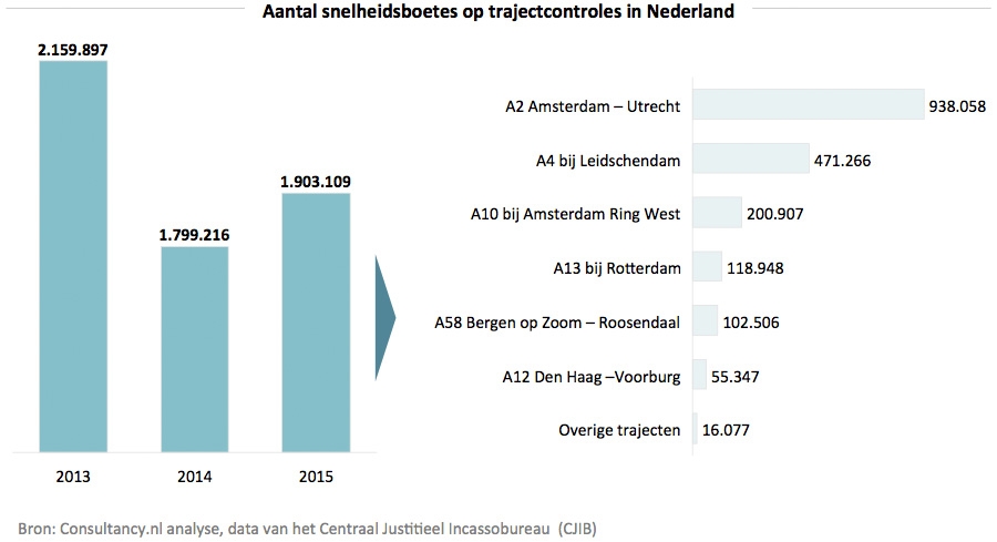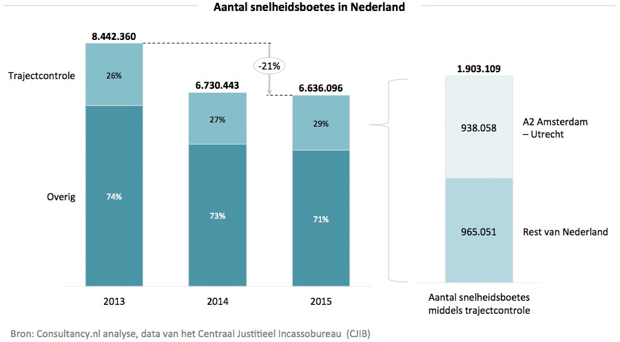 Van de andere trajectcontroles in Nederland steeg het aantal uitgeschreven boetes wel. In 2014 lag het aantal snelheidsboetes van trajectcontroles op bijna 1,8 miljoen (27%) op een totaal van ruim 6,7 miljoen snelheidsboetes. In 2015 ligt deze verhouding hoger met 1,9 miljoen stuks op een totaal aantal boetes voor te hard rijden van 6,6 miljoen – bijna 29%.