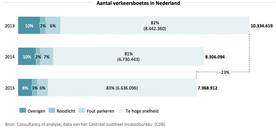 In totaal schreven verkeersagenten en parkeeragenten in 2015 ruim 7,9 miljoen ‘bonnen’. Dat zijn er bijna 350.000 minder dan in 2014, en ruim 2 miljoen minder dan in 2013. De boetes zijn onderverdeeld in vier categorieën: snelheids-, parkeer-, verkeerslicht- en overige boetes. De enige boetecategorie die in 2015 is gegroeid is die voor door rood rijden – hier werden ruim 30.000 meer overtredingen beboet. De daling in het aantal boetes in andere categorieën wordt voornamelijk verklaard door meerdere CAO-acties van de politiebonden – iets wat ook duidelijk zichtbaar is in het halveren van het percentage staandehoudingen (van 6% naar 3%) ten opzichte van het aantal boetes dat werd geschreven op basis van het kenteken.
