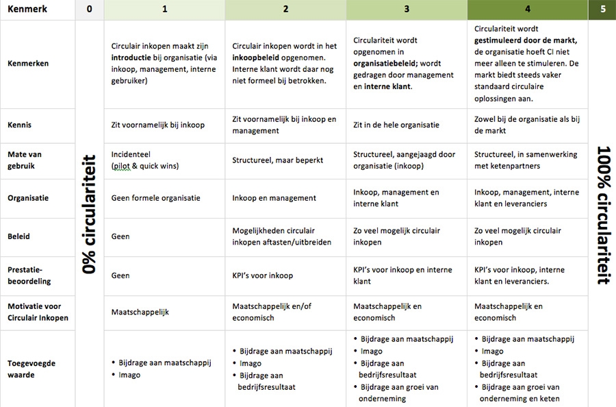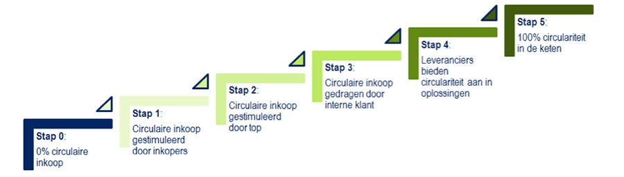 De afgelopen maanden heeft Supply Value, een inkoopspecialist uit Arnhem, onderzoek gedaan naar circulair inkopen in de praktijk. Uit de studie komt naar voren dat circulair inkopen in vijf opeenvolgende stappen kan worden toegepast: van 0% circulair inkopen tot 100% circulariteit in de keten. Stap 0 betekent dat een organisatie nog niet aan circulair inkopen doet. Bij stap 5 is 100% circulariteit in de keten gewaarborgd – de keten is ingesteld op circulariteit en het wordt gezien als de standaard waarbij automatisch wordt gekeken naar circulaire oplossingen.