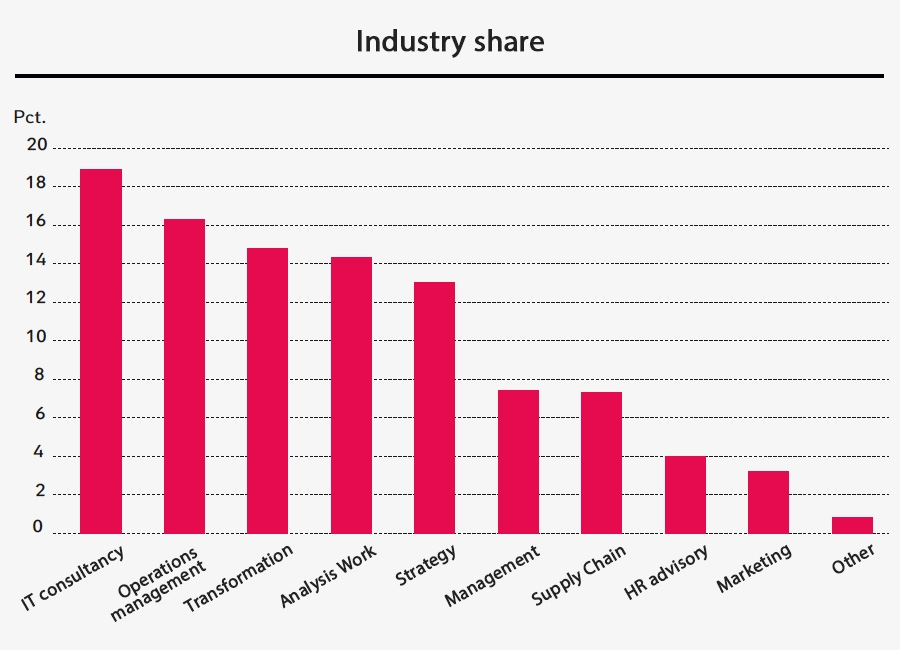Als gekeken wordt naar de vakgebieden waarin Deense adviesbureaus werkzaam zijn, wordt duidelijk dat ‘IT-consulting’ het grootste vakgebied vormt voor Deense management consultants, met bijna 20% van de markt. Daarna volgen ‘operations management’ en ‘transformation’, met respectievelijk 16% en 15%. In vergelijking met 2010 is de vraag naar operations consulting aanzienlijk gegroeid (+6% van het marktaandeel ), als gevolg van de stijgende vraag naar diensten op het snijvlak van Lean, Agile en Business Process Management, een trend die wereldwijd zichtbaar is. Het aandeel van pure strategie consultancydiensten is daarentegen gedaald met 2% naar een marktaandeel van 15%. Opgemerkt dient te worden dat de stijgende vraag van klanten naar strategie executie in het model van MR valt onder het vakgebied transformatie consulting.