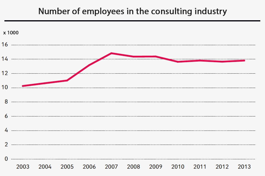Ondanks de financiële groei die de Deense management consultancybranche vertoont, is het personeelsbestand van de consultancybureaus opvallend genoeg relatief stabiel gebleven. In 2003 creëerde de sector net iets meer dan 100.000 banen, en in de ‘gouden jaren’ die tussen 2004 en 2007 volgden, in lijn met internationale ontwikkelingen, groeide het aantal werknemers in de adviesbranche tot bijna 150.000. Sinds de daling in 2010 van het aantal werknemers naar een dieptepunt van minder dan 140.000, is het aantal banen met slechts 1% gestegen. Volgens MR wijst dit erop dat bureaus betere marges weten te halen voor hun projecten (hogere gemiddelde tarieven) evenals een verbetering zien in de omzet per medewerker.