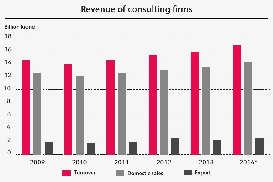 De data toont aan dat Deense consultancybureaus zich goed hebben weten te herstellen van de financiële crisis en de nasleep daarvan. Hoewel de omzetten tussen 2009 en 2010 met net minder dan 5% daalden, wist de branche vanaf 2010 de neerwaartse spiraal te doorbreken en vertoonde de markt weer groei over de hele breedte. In vergelijking met 2010 lag de totale omzet in 2014 20% hoger, waarbij de omzet uit export adviesdiensten groeide met maar liefst 40%. Deze maakte echter maar een klein gedeelte uit van de Deense adviesbranche, die zijn omzet voor ongeveer 85% uit diensten binnen de landsgrenzen haalt.