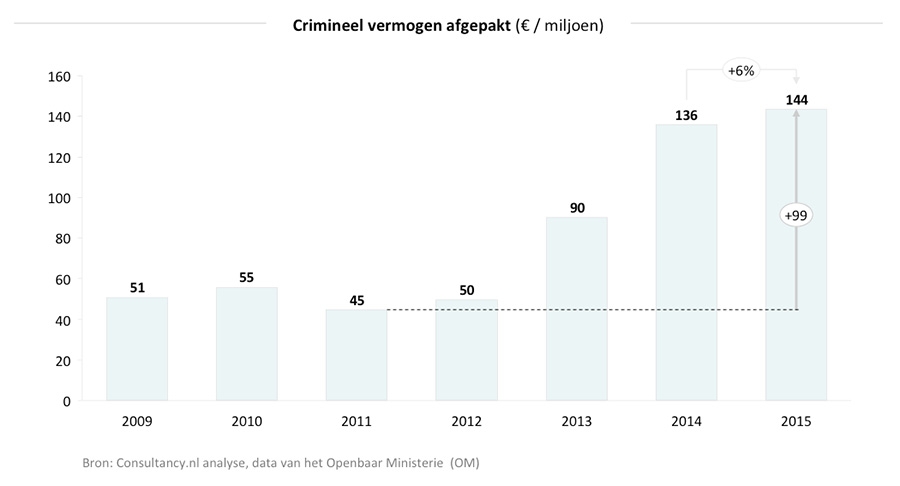Het Openbaar Ministerie heeft afgelopen jaar een recordbedrag aan crimineel vermogen ‘afgepakt’. In het kader van project ‘Afpakken’, ook wel ‘Plukze’ genoemd, is in 2015 in totaal ruim €140 miljoen geïncasseerd van criminelen en bedrijven die de regels hebben overtreden – bijvoorbeeld via fraudezaken. Dat is ruim drie keer zoveel als in 2011, toen zo’n €45 miljoen aan crimineel geld werd teruggevorderd.
