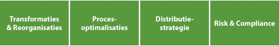 “Ons aanbod is inderdaad ruim in die zin dat we verzekeraars helpen met uitdagingen binnen het volledige operating model. We kennen de processen langs de front- en backside door en door, of het nu gaat om individueel leven, groepsverzekeringen of varia. Maar we adviseren altijd vanuit de business, wij zijn geen IT-consultants en schrijven zelf geen software. Onze opdrachten vallen meestal binnen één van volgende trajecten.