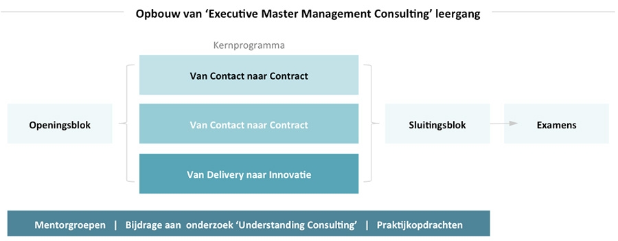 Het programma van de ‘Executive Master Management Consulting’ (EMMC) opleiding is verdeeld over zes blokken: Een ‘Openingsblok’, gevolgd door de module ‘Van Contact naar Contract’, waarin onder meer acquisitie, financieel management voor adviseurs en business analytics en big data centraal staan. Het derde blok is de module ‘Van Contract naar Interventie’; hier wordt onder andere ingegaan op succesvolle projecten, teams en projecten, staan veranderprocessen centraal en leren deelnemers om doeltreffend te argumenteren en rapporteren. Het volgende blok is ‘Van Delivery naar Innovatie’. In dit deel van het programma worden bijvoorbeeld evidence-based adviseren en visueel denken & creatief problemen oplossen behandeld, en leren consultants om progressie te boeken als individu, team en bureau. De leergang wordt afgesloten door een sluitingsblok en examens.