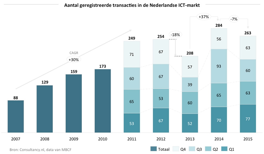 Sinds 2007 heeft de ICT-markt in ons land een flinke toename gezien in het aantal geregistreerde transacties. Tussen 2007 en 2011 steeg het aantal fusie- en overnames in de ICT met gemiddeld 30% per jaar van 88 naar 249. Dat blijkt uit data van corporate finance kantoor MBCF. Na een toenmalig record van 254 deals in 2012 zakte de overnamemarkt in 2013 weer iets terug, met 18% naar 208 deals. De markt warmde echter weer op toen in 2014 zowel verschillende kwartaalrecords als het jaarrecord werden doorbroken. Het eerste kwartaal bracht toen 70 fusies en overnames, en het derde kwartaal maar liefst 93. Het jaartotaal voor 2014 kwam uit op 284 deals.