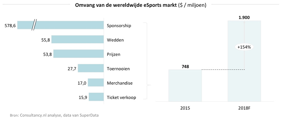De komende jaren brengen een indrukwekkende groei voor de online sports gaming markt, ook wel bekend als de eSports markt of online gamesport. De markt had in 2015 een totale waarde van zo’n $748 miljoen , waarbij voornamelijk sponsoring en advertising veel waarde creëren. Analisten voorstellen dat de eSports markt tussen nu en 2018 zal groeien naar een waarde van $1,9 miljard.